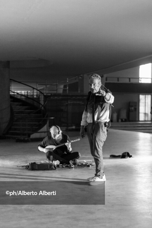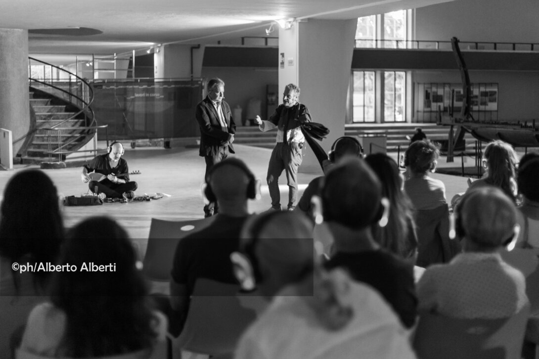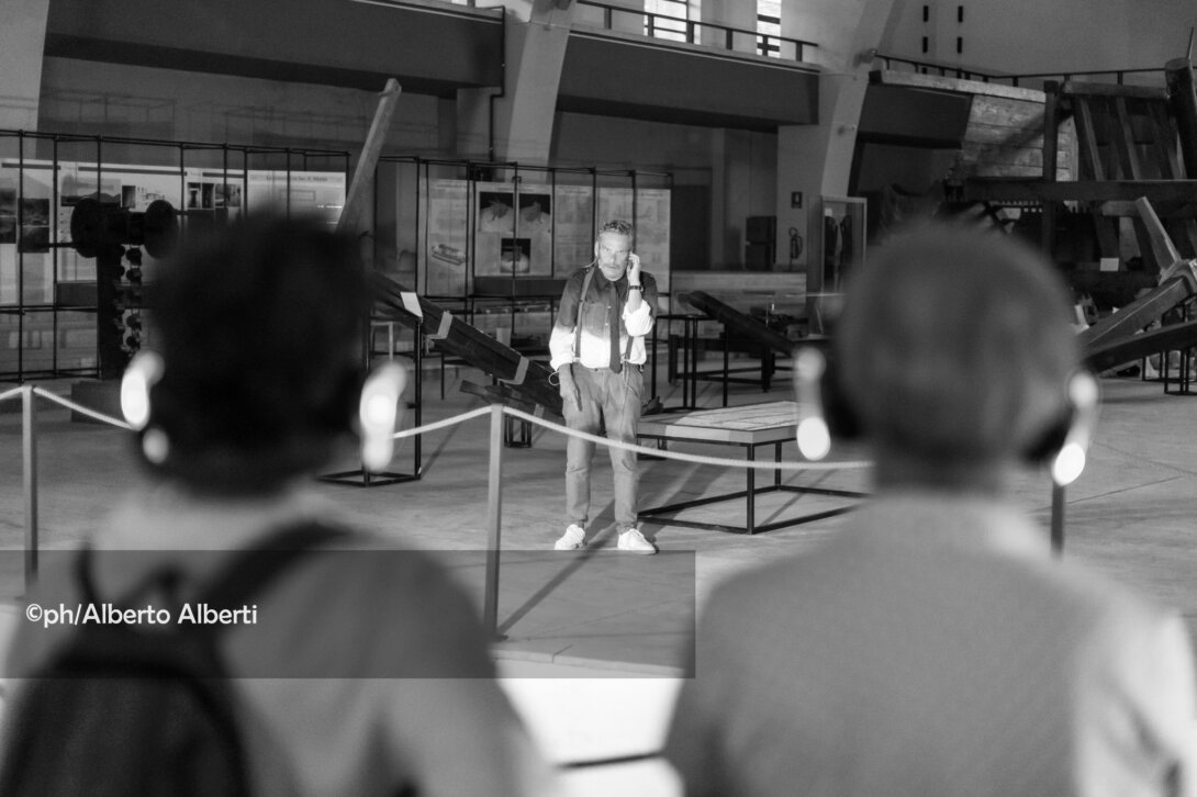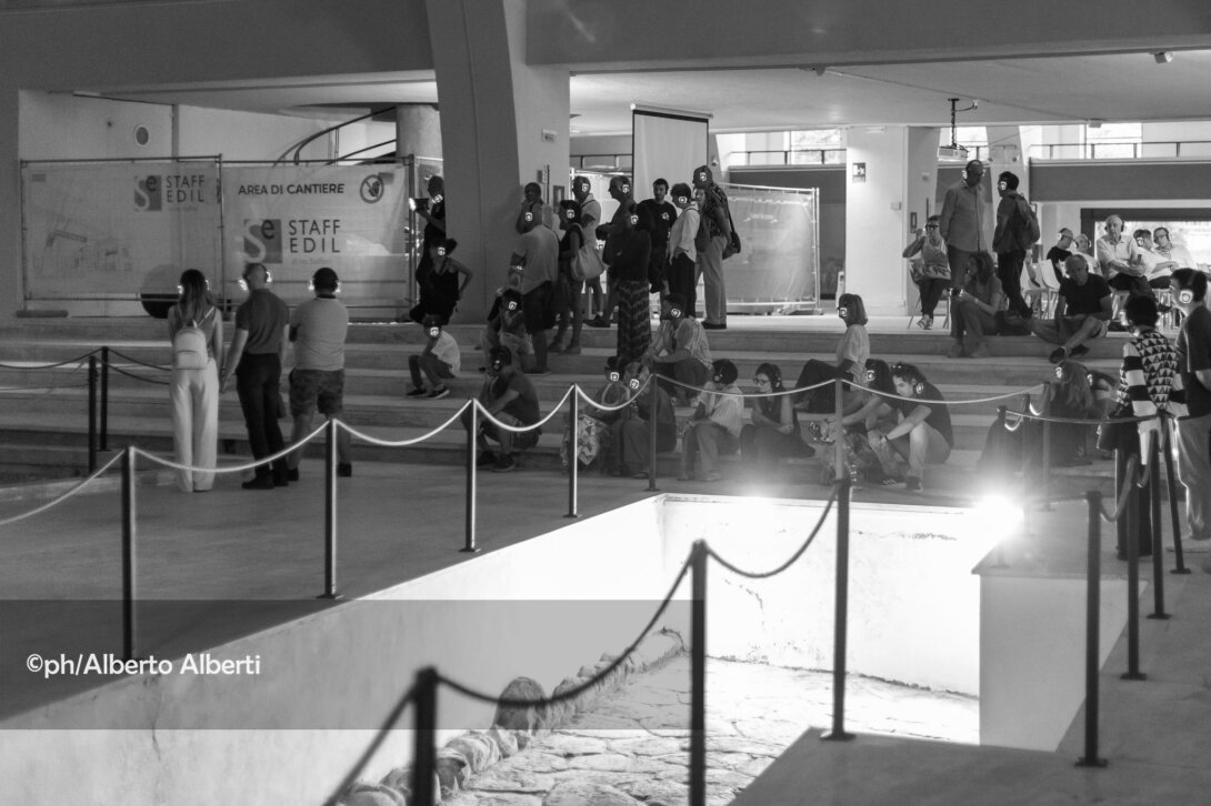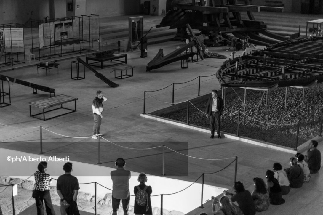 Questi due grandi hangar vuoti pieni di reperti e memorie sono il luogo ideale per la nostra formula di teatro mobile, che prevede l'ascolto in cuffia e quindi evita tutti i riverberi di questa struttura. Utilizziamo testi legati il più possibile alla memoria di questo luogo, dalle navi ai reperti archeologici, alla strada, alle memorie di Caligola, che è una delle presenze più importanti qui. Oggi, 31 agosto, rappresenteremo "Caligola", riscritto da Pina Catanzariti per due attori, Fabrizio Parenti e Paolo Musio, con le musiche dal vivo di Felice Zaccheo. È una rappresentazione sperimentale che abbina la follia dell'imperatore Caligola a un'altra grande riscrittura del '900, dedicata a Nerone, con Petrolini.